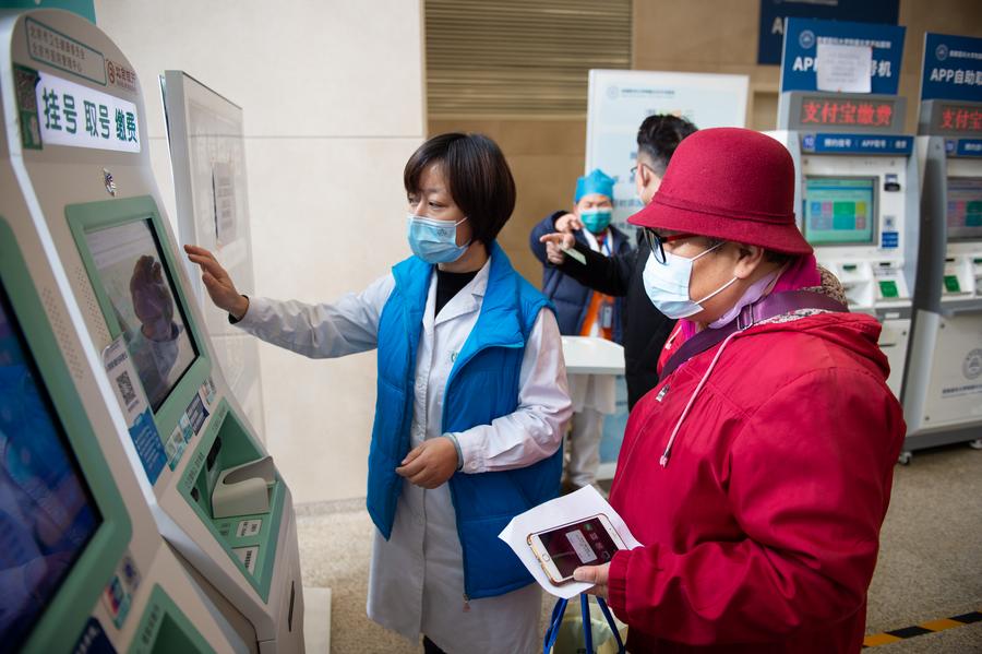 A staff member helps a senior citizen check the appointment information on a machine at Beijing Tiantan Hospital under the Capital Medical University in Beijing, China, Dec 9, 2020. (PHOTO / XINHUA)