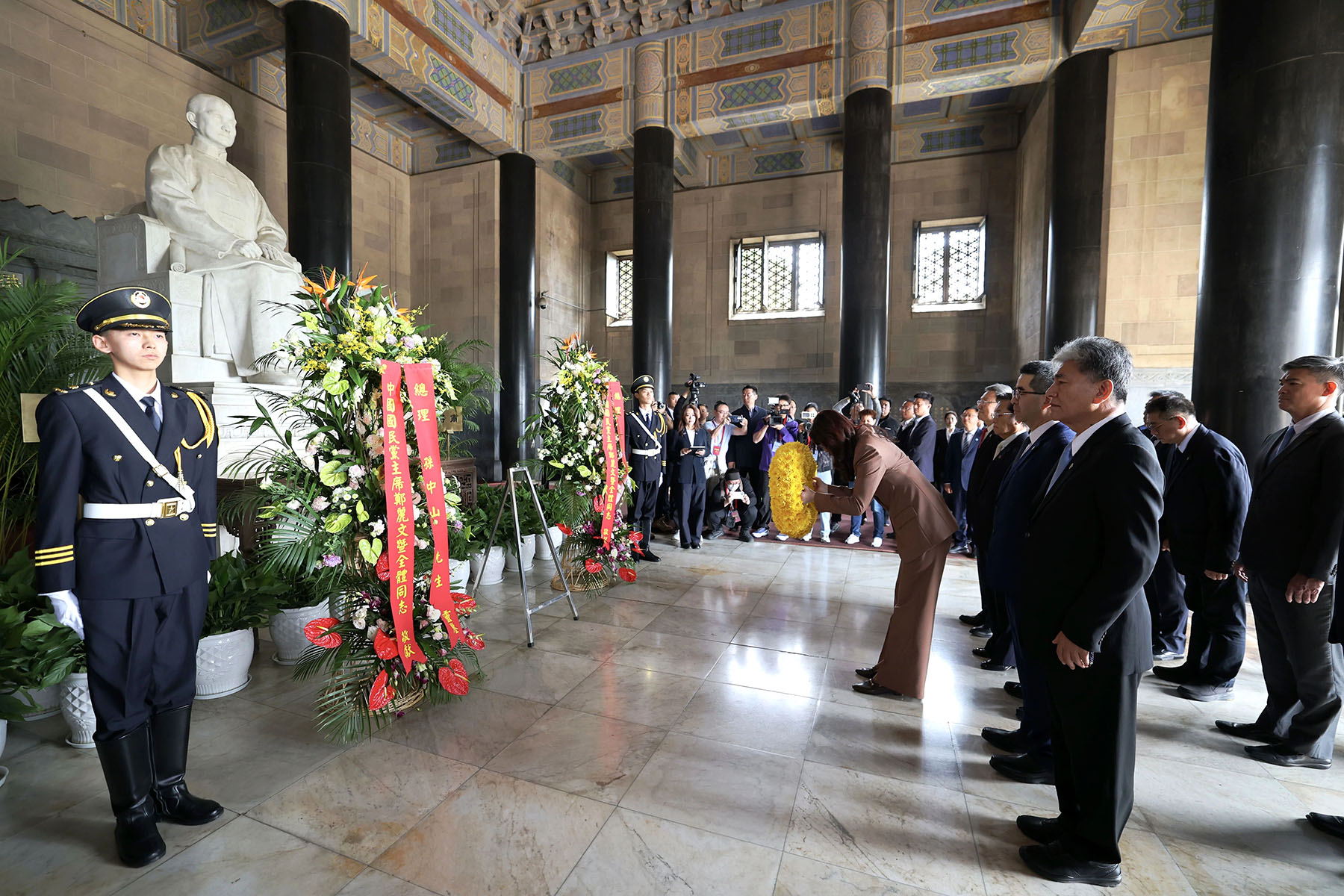 Following a tradition for KMT leaders visiting the Chinese mainland, Cheng led a delegation to pay tribute at the Sun Yatsen Mausoleum in Nanjing on Wednesday morning. After ascending 392 steps, she presented a wreath. Members of the delegation, including three KMT vice-chairpersons — Lee Chien-lung, Chang Jung-kung and Hsiao Hsu-tsen — bowed three times and observed a moment of silence. The delegation then visited the chamber where the coffin of Sun is placed.