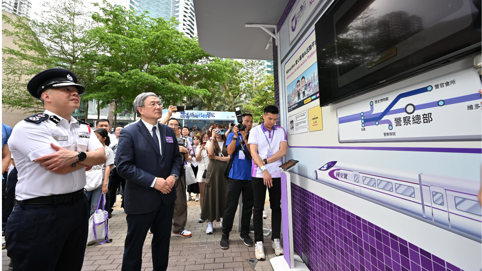 Deputy Chief Secretary for Administration Warner Cheuk Wing-hing (second left), accompanied by Commissioner of Police Joe Chow Yat-ming (first left), visits the new “NSmarties AI Interactive Platform” during the National Security Education Day 2026 cum Hong Kong Police Force Fun Day in Admiralty on April 12, 2026. (PHOTO/HKSAR GOVT)