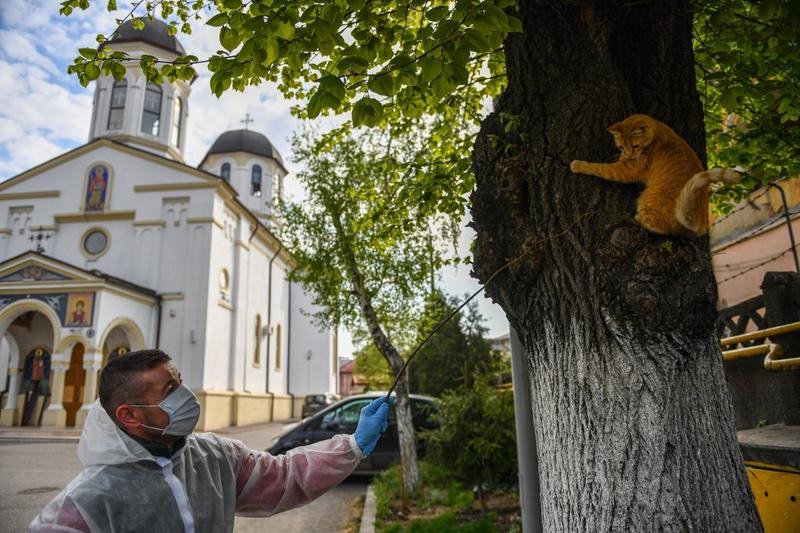 A Romanian Christian Orthodox volunteer, wearing protective outfits, plays with his tomcat called "Trump" in the courtyard of a church on the Easter Sunday on April 12, 2020 after a religious service held within closed doors.