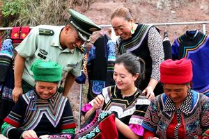 Women make pieces of Yi embroidery in front of Buha, a poverty alleviation officer from the Sichuan People's Armed Police Force, in Suosuolada, Liangshan Yi autonomous prefecture, Sichuan province, last year. (PHOTO PROVIDED TO CHINA DAILY)