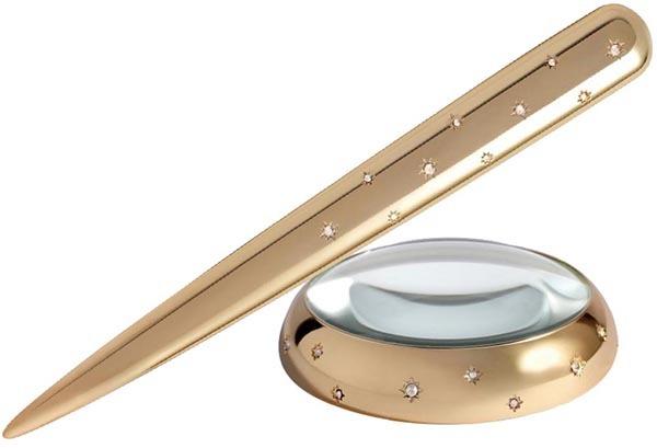 Stars letter opener and magnifying glass in gold with white crystals, L’Objet