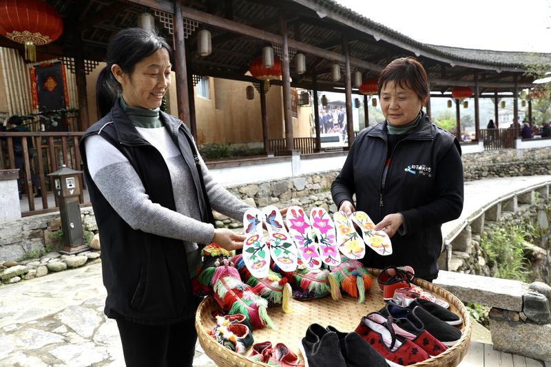 At a store selling handmade insoles, Hu Yourong, 52, is busy embroidering a pair. She earns 1,500 yuan a month and started at the store last year. She says many women of her age are making insoles, too, to sell to tourists, with each pair costing 100 yuan. "Before, we planted peanuts and rice and wore the insoles mainly ourselves," she says.