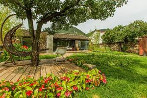 They retain the original wooden roof-and-beam structures and evoke a pastoral charm along with hawthorn trees, short walls and floor-to-ceiling windows. The rooms' interiors feature modern furniture and home appliances.