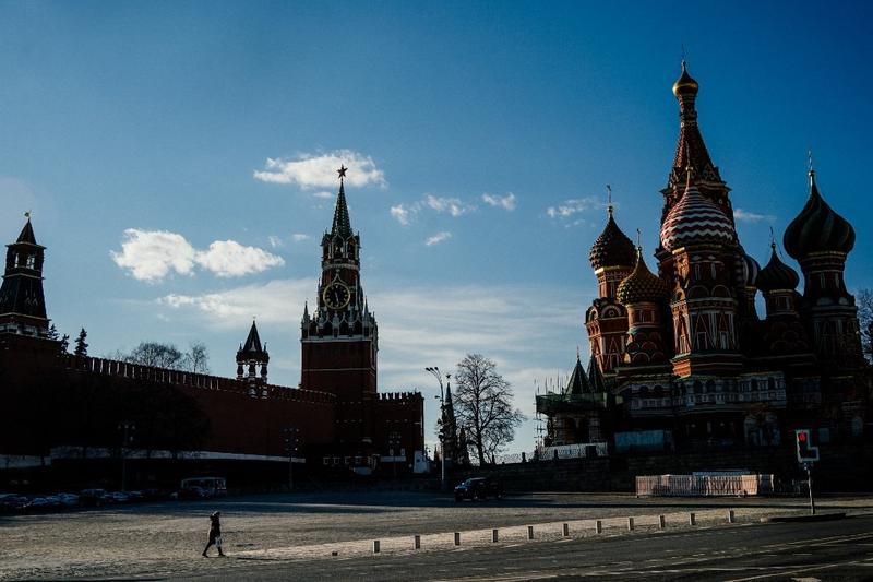 A woman walks near the Kremlin in downtown Moscow on April 12, 2020. (DIMITAR DILKOFF / AFP)