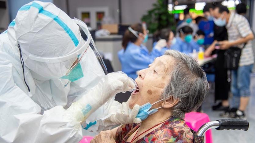 A medical worker collects a swab sample from a resident for COVID-19 nucleic acid testing in Wuhan, central China's Hubei province, Aug 3, 2021. (WU ZHIZUN / XINHUA)