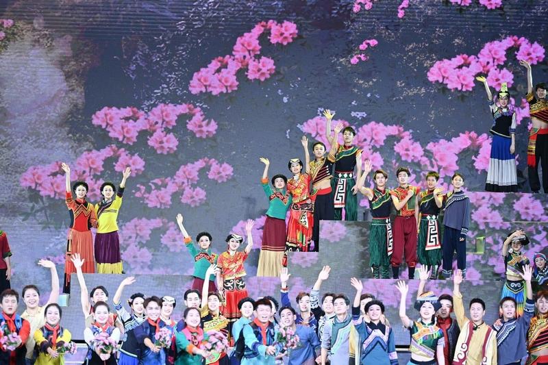 Performers greet the audience at the gala performance of the sixth ethnic minority art festival in Beijing on Tuesday evening. The gala featured songs and dances showcasing the distinctive cultures of different ethnic groups. (LI XIANG / XINHUA)