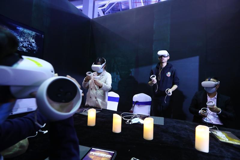 Visitors wearing VR headsets participate in a jubensha game during a high-tech expo in Nanchang, Jiangxi province, in October. (LIU ZHANKUN / CHINA NEWS SERVICE)