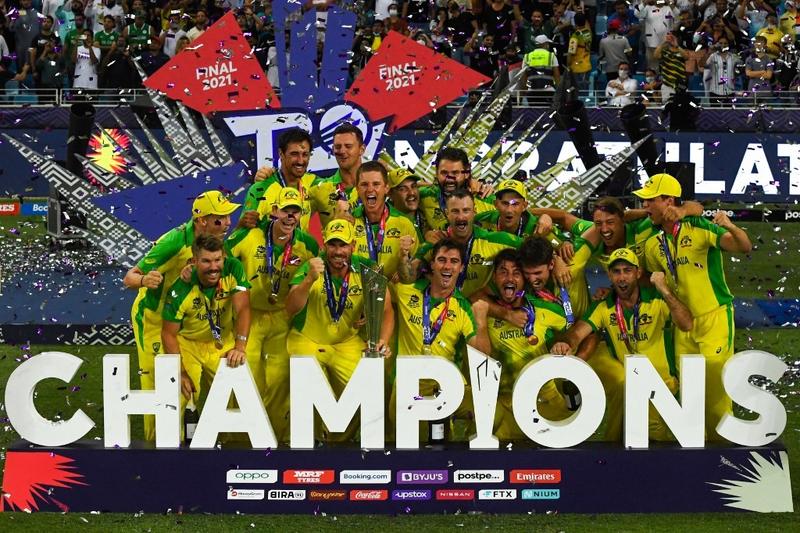 Australia's cricketers celebrate with their winning trophy at the end of the ICC men’s Twenty20 World Cup final match between Australia and New Zealand at the Dubai International Cricket Stadium in Dubai on Nov 14, 2021. (INDRANIL MUKHERJEE / AFP)