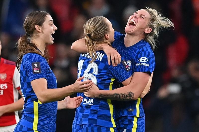 Chelsea's English defender Millie Bright (right) and Chelsea's Swedish defender Magdalena Eriksson (center) embrace as Chelsea players celebrate on the pitch after the English Women's FA Cup final football match between Arsenal and Chelsea at Wembley Stadium in London on Dec 5, 2021. (BEN STANSALL / AFP)