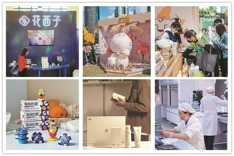 (Clockwise from top) Products manufactured in China that have made their mark on the domestic market include those from cosmetic brand Florasis, Yongpu Coffee (top center and right), cosmetic brands XDG and Yu Brand, and health company Bio-Everyday. (YI BAI/FOR CHINA DAILY)