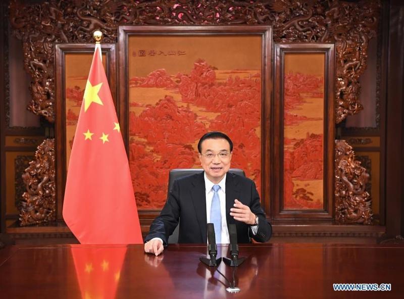 Chinese Premier Li Keqiang delivers a video speech at a New Year banquet held by Britain's 48 Group Club on Feb 3, 2021. (RAO AIMIN / XINHUA)