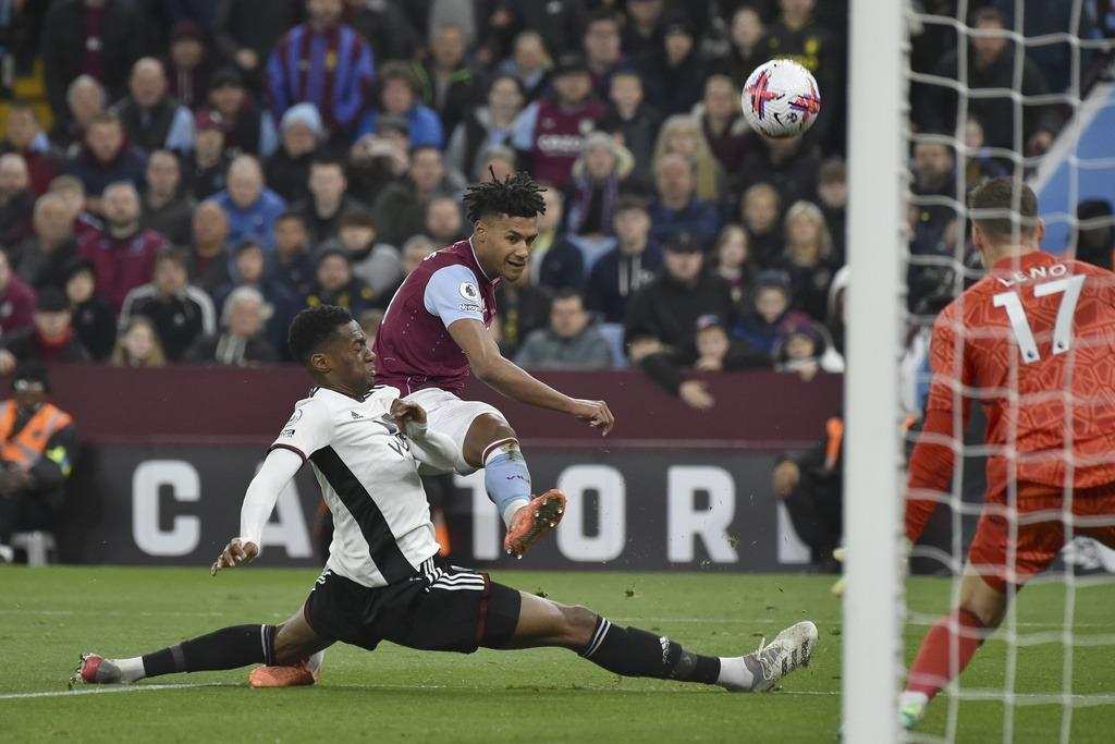 Aston Villa's Tyrone Mings (center) takes a shot at goal during the English Premier League soccer match between Aston Villa and Fulham at Villa Park in Birmingham, England, on April 25, 2023. (PHOTO / AP)