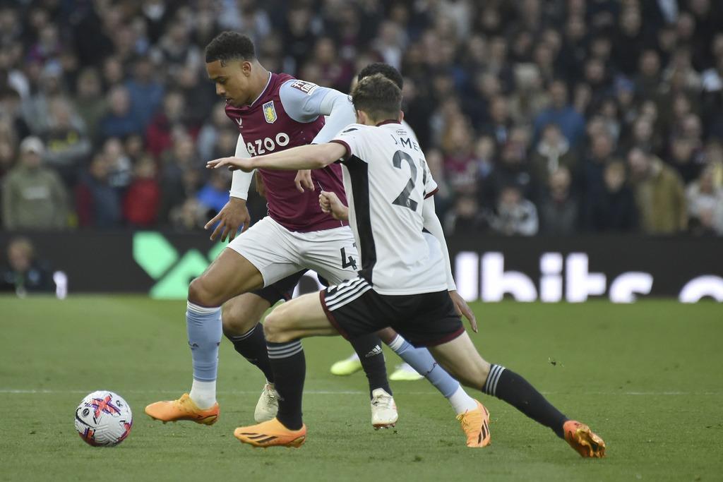 Aston Villa's Jacob Ramsey (left) is challenged by Fulham's Daniel James during the English Premier League soccer match between Aston Villa and Fulham at Villa Park in Birmingham, England, on April 25, 2023. (PHOTO / AP)