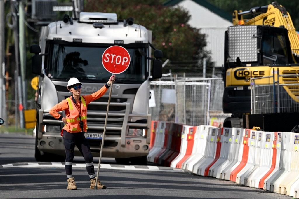 A worker holds a stop sign on a construction site, building new apartments in Melbourne on April 4, 2023. (PHOTO / AFP)