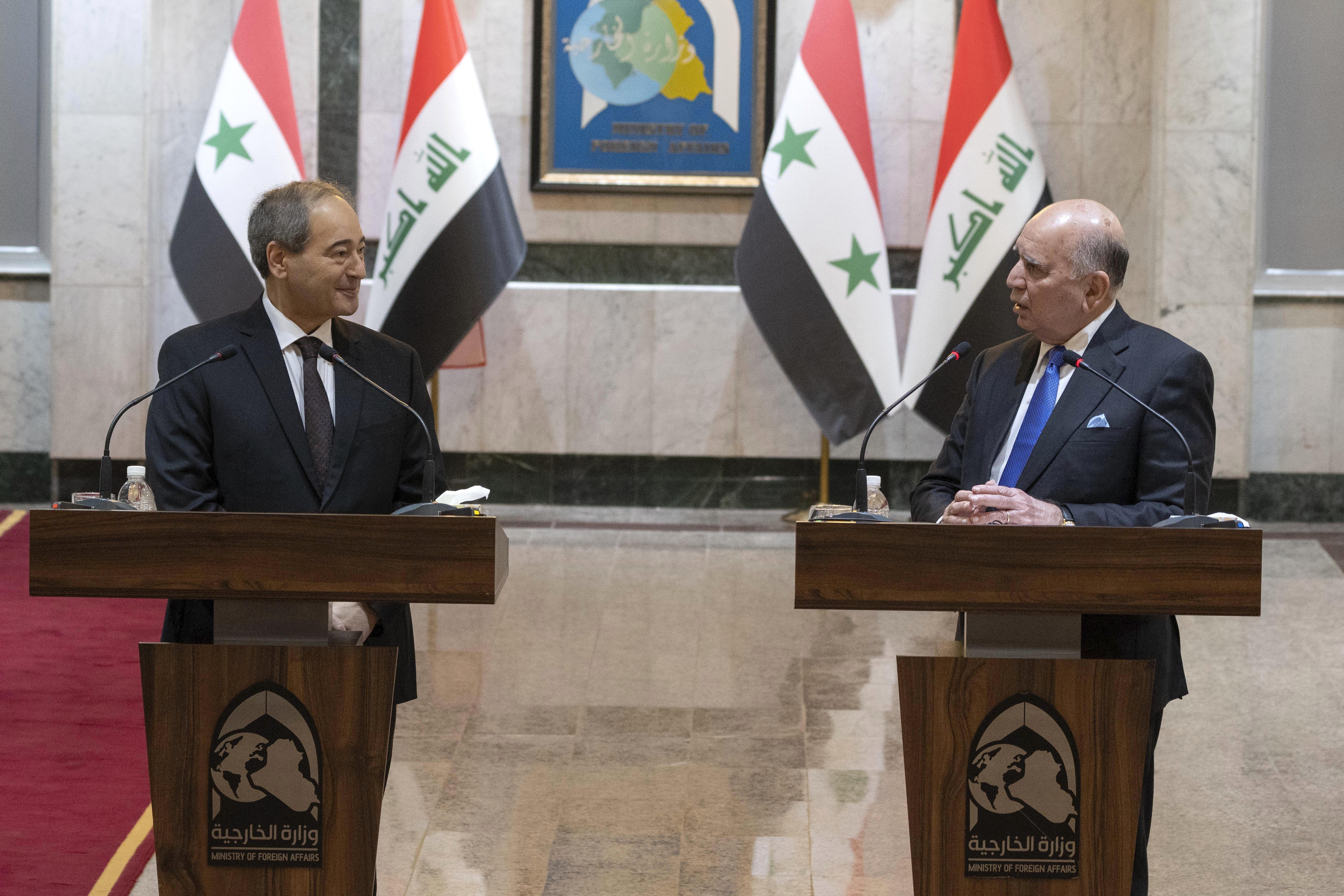 Iraqi Foreign Minister Fouad Hussein (right) and his Syrian counterpart Faisal Mekdad (left) attend a press conference in Baghdad, Iraq, June 4, 2023. (PHOTO / AP)