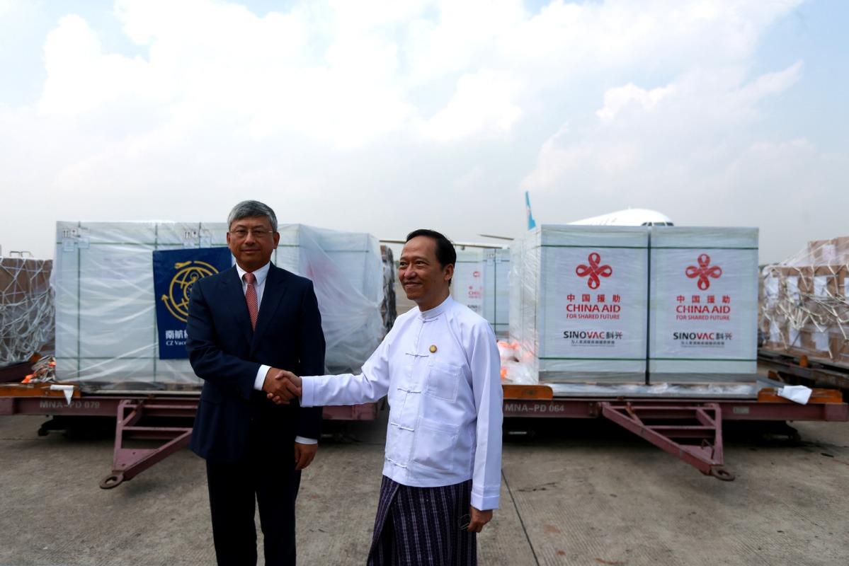 This file photo shows Chinese Ambassador to Myanmar Chen Hai (left) attends a handover ceremony for vaccines in Yangon on December 22, 2021. (PHOTO / XINHUA)