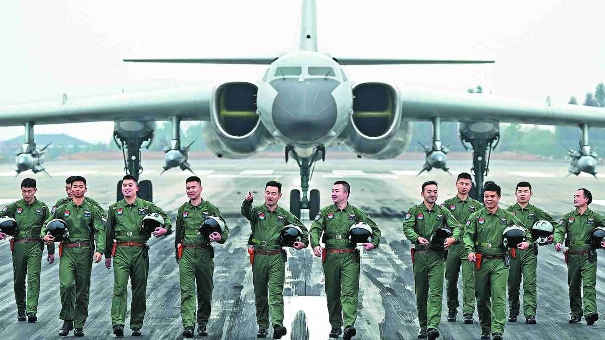Pilots of the bomber unit that has been honored with the title of "Role Model of the Times" walk on the runway after completing their mission. (PHOTO / CHINA DAILY)
