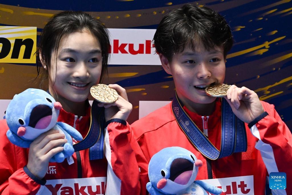 Chen Yiwen (left) / Chang Yani of China pose with their medals during the awarding ceremony after the women's 3m synchronised final of the World Aquatics Championships 2023 in Fukuoka, Japan, July 17, 2023. (PHOTO / XINHUA)