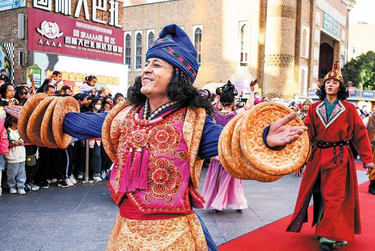 A performer, wearing a costume featuring nang bread, participates in a parade on Monday to promote local specialties among tourists at the Grand Bazaar in Urumqi, Xinjiang Uygur autonomous region. (PHOTO / XINHUA)