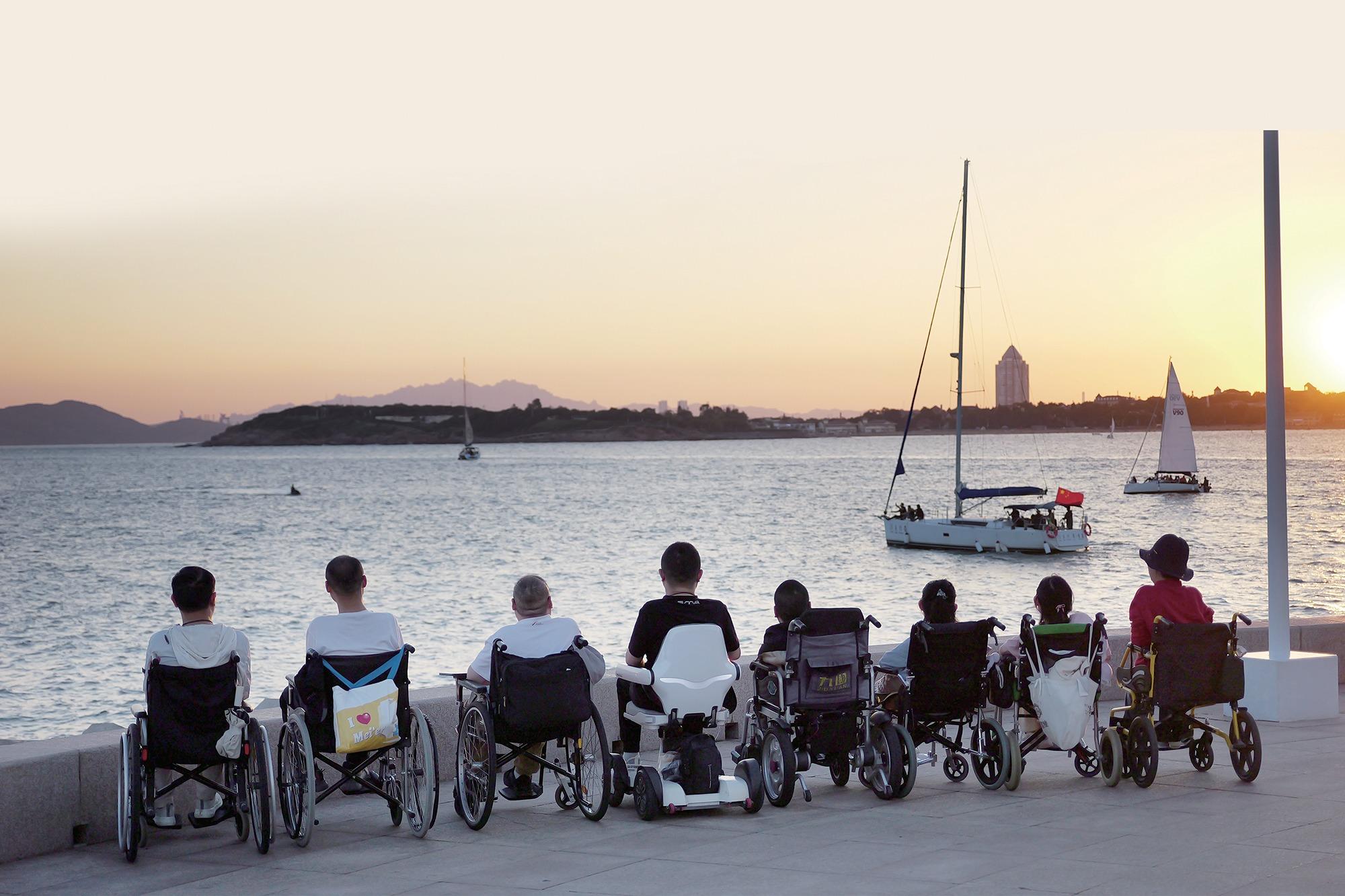 Xu Yong (fourth from left) and a group of other SMA patients were watching the sunset in Qingdao on Sept 21, 2023. (PHOTO PROVIDED TO CHINA DAILY)