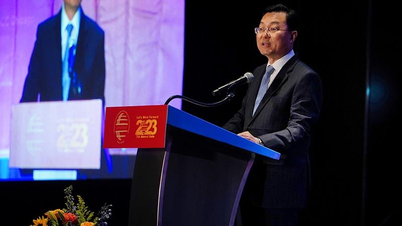 Xie Feng, Chinese ambassador to the US, speaks at the China General Chamber of Commerce (CGCC) Chicago 2023 Annual Gala on Monday. (MINLU ZHANG / CHINA DAILY)