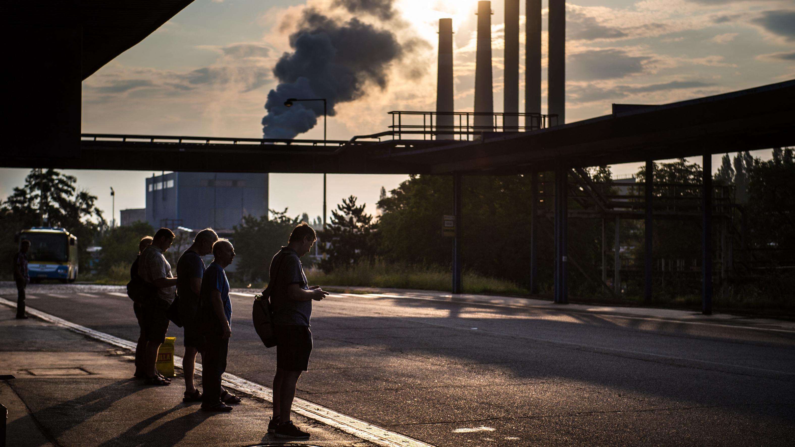 In this file photo dated July 30, 2019, workers wait at the bus stop at the US Steel Kosice steel-mill in the early morning in Kosice, eastern Slovakia. (PHOTO / AFP)