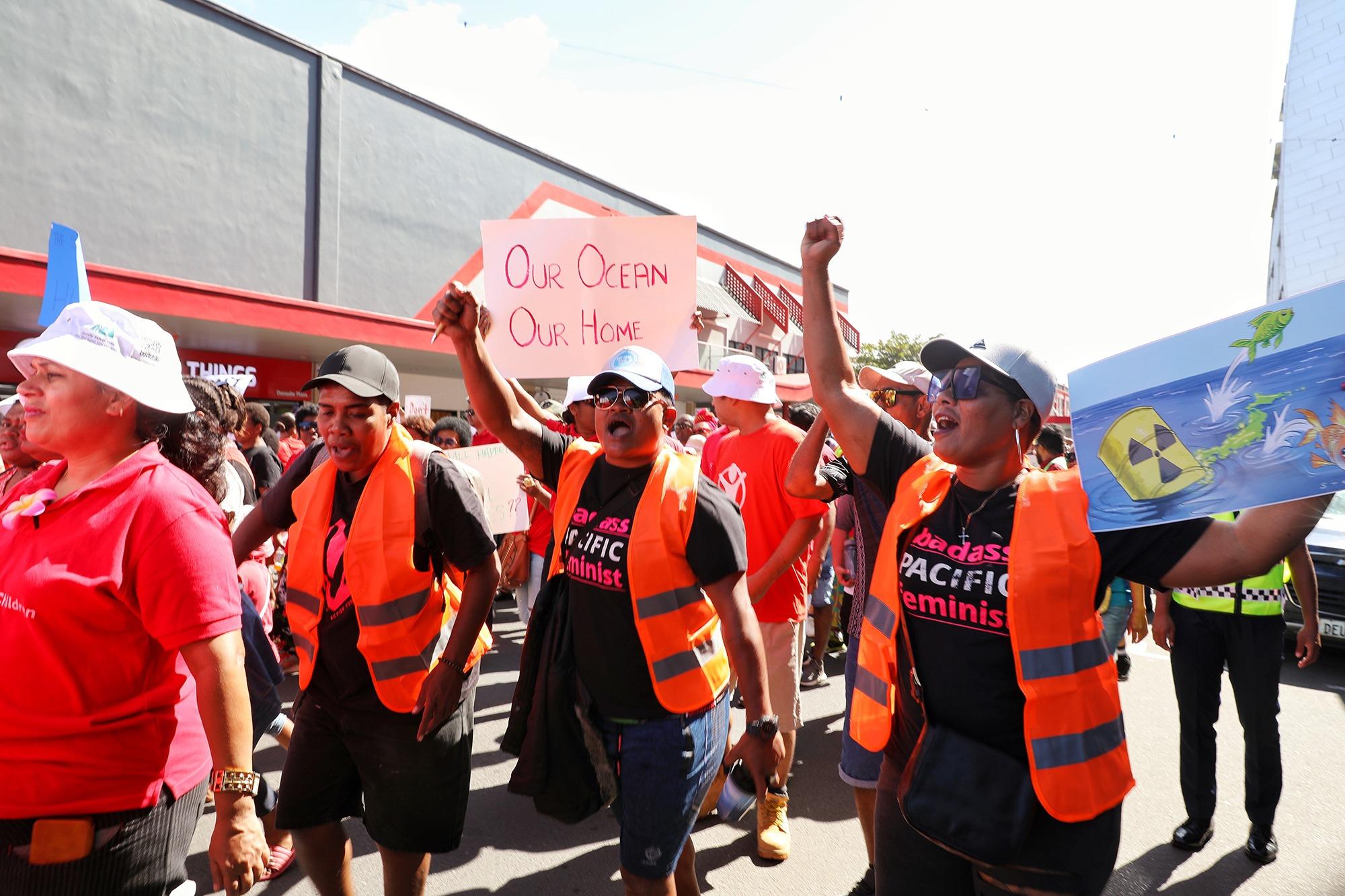 People attend a rally in Suva, Fiji, on Aug 25 against Japan's dumping of nuclear-contaminated water into the Pacific Ocean. (PHOTO / XINHUA)