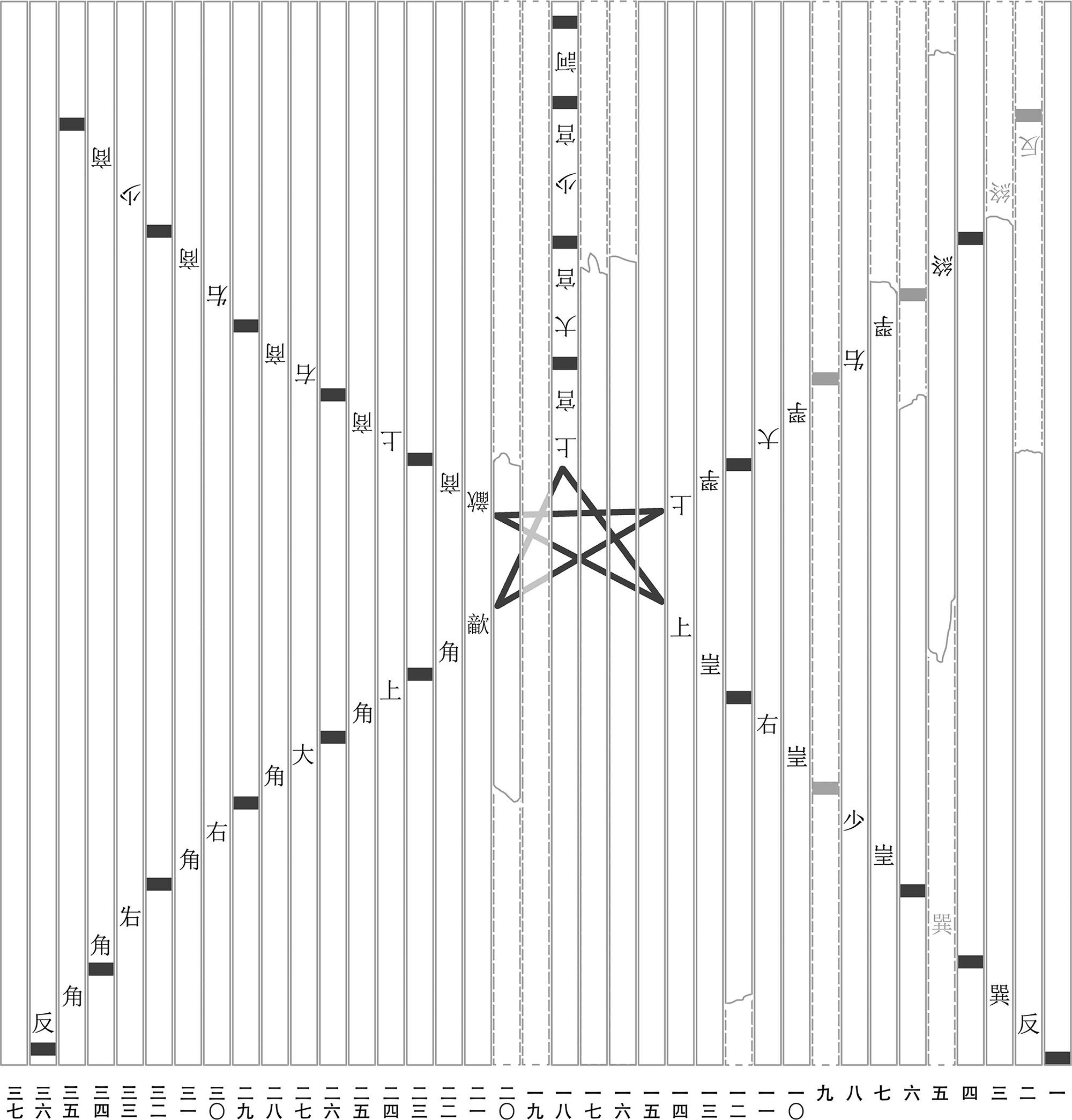 Each of its projecting points is marked with one note that ancient Chinese people applied, and the extension lines on each side of the pentagram are marked with the certain note in different octaves.
