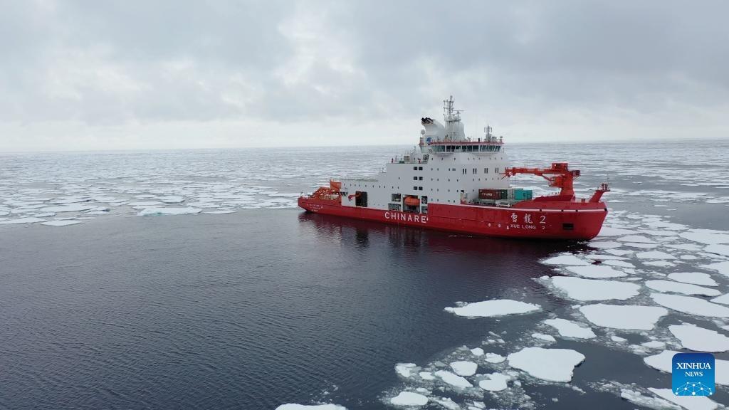 This aerial photo taken on Jan 6, 2024 shows China's research icebreaker Xuelong 2 conducting scientific expedition in the Amundsen Sea. Members of China's 40th Antarctic expedition team have recently conducted scientific work aboard China's research icebreaker Xuelong 2 in the Amundsen Sea. (PHOTO / XINHUA)
