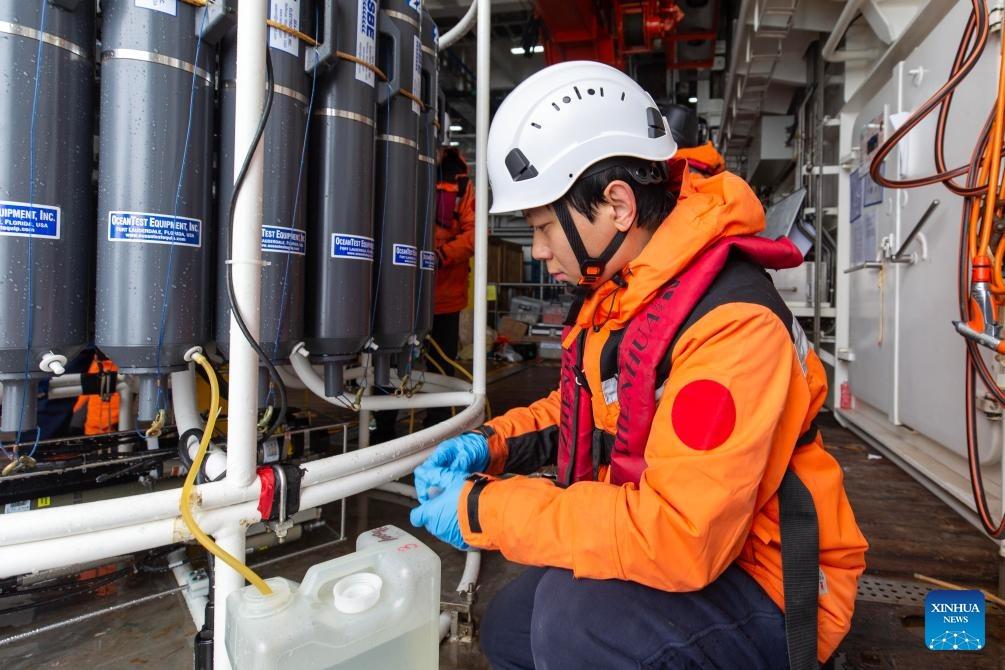 A member of China's 40th Antarctic expedition deals with collected samples of seawater aboard China's research icebreaker Xuelong 2 in the Amundsen Sea, Jan 7, 2024. (PHOTO / XINHUA)
