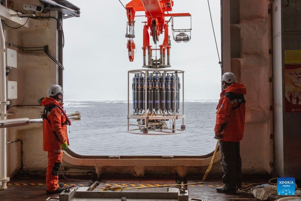Members of China's 40th Antarctic expedition team conduct scientific work aboard China's research icebreaker Xuelong 2 in the Amundsen Sea, Jan 7, 2024. (PHOTO / XINHUA)