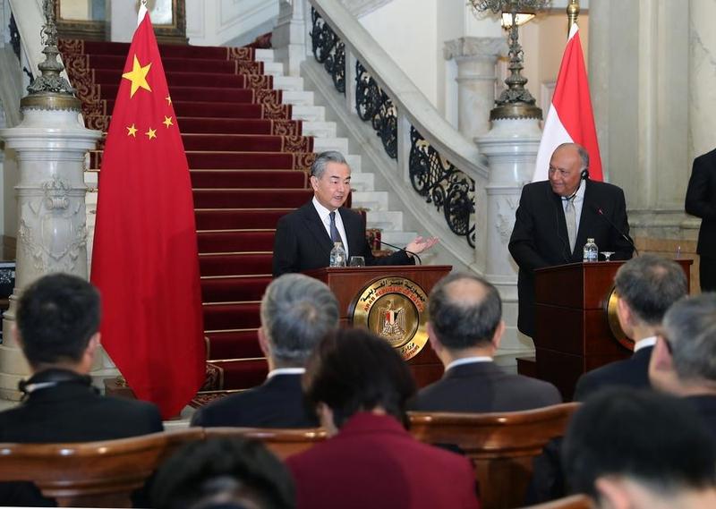 Chinese Foreign Minister Wang Yi, also a member of the Political Bureau of the Communist Party of China Central Committee, and Egyptian Foreign Minister Sameh Shoukry jointly meet the press after their talks in Cairo, Egypt, Jan 14, 2024. (PHOTO / XINHUA)