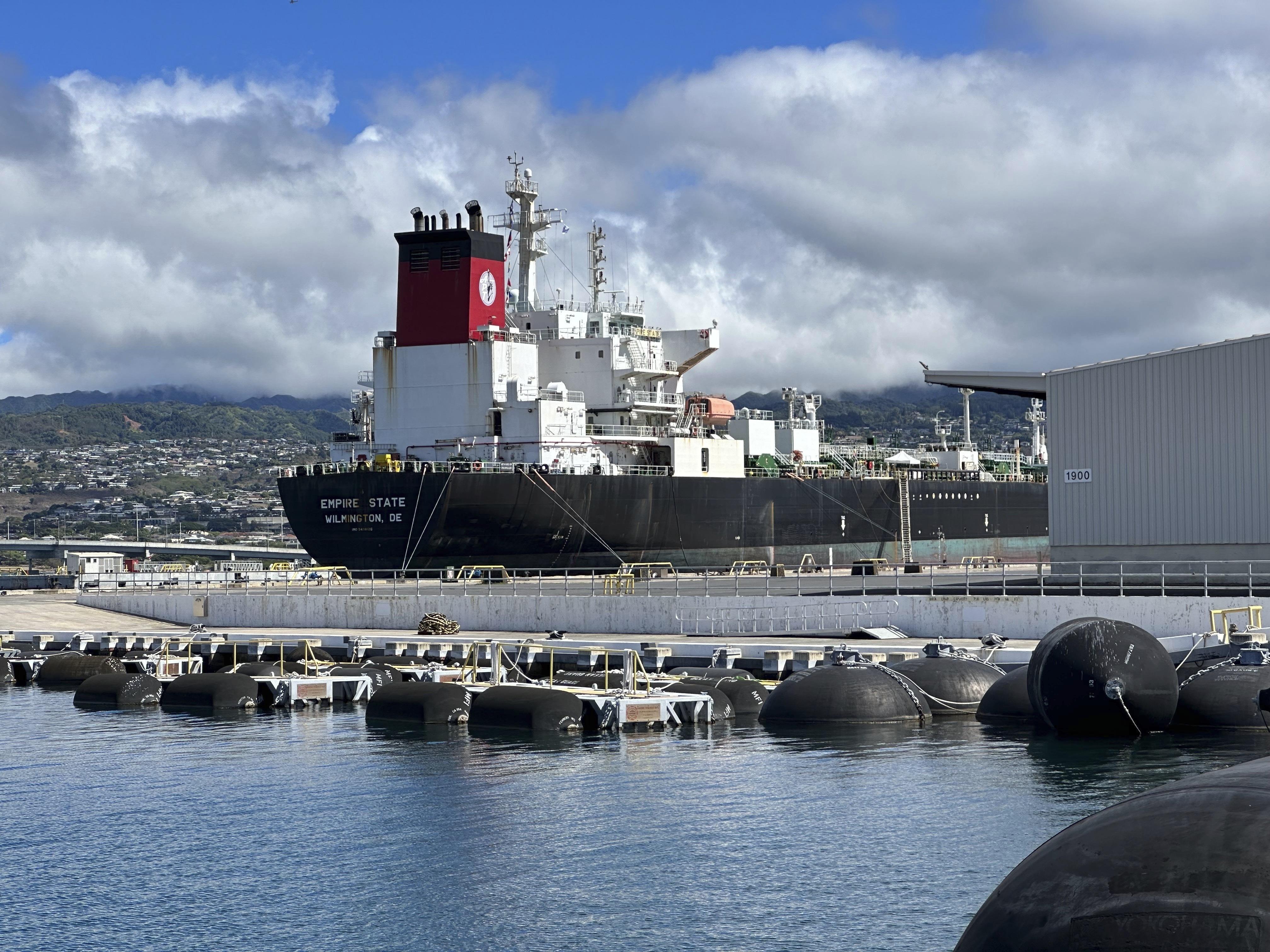The tanker Empire State sits at a pier at Joint-Base Pearl Harbor-Hickam, Hawaii on Oct 13, 2023 before the US military begins draining fuel from the Red Hill Bulk Fuel Storage Facility, which leaked fuel into a drinking water well and poisoned 6,000 people in 2021. (PHOTO / AP)