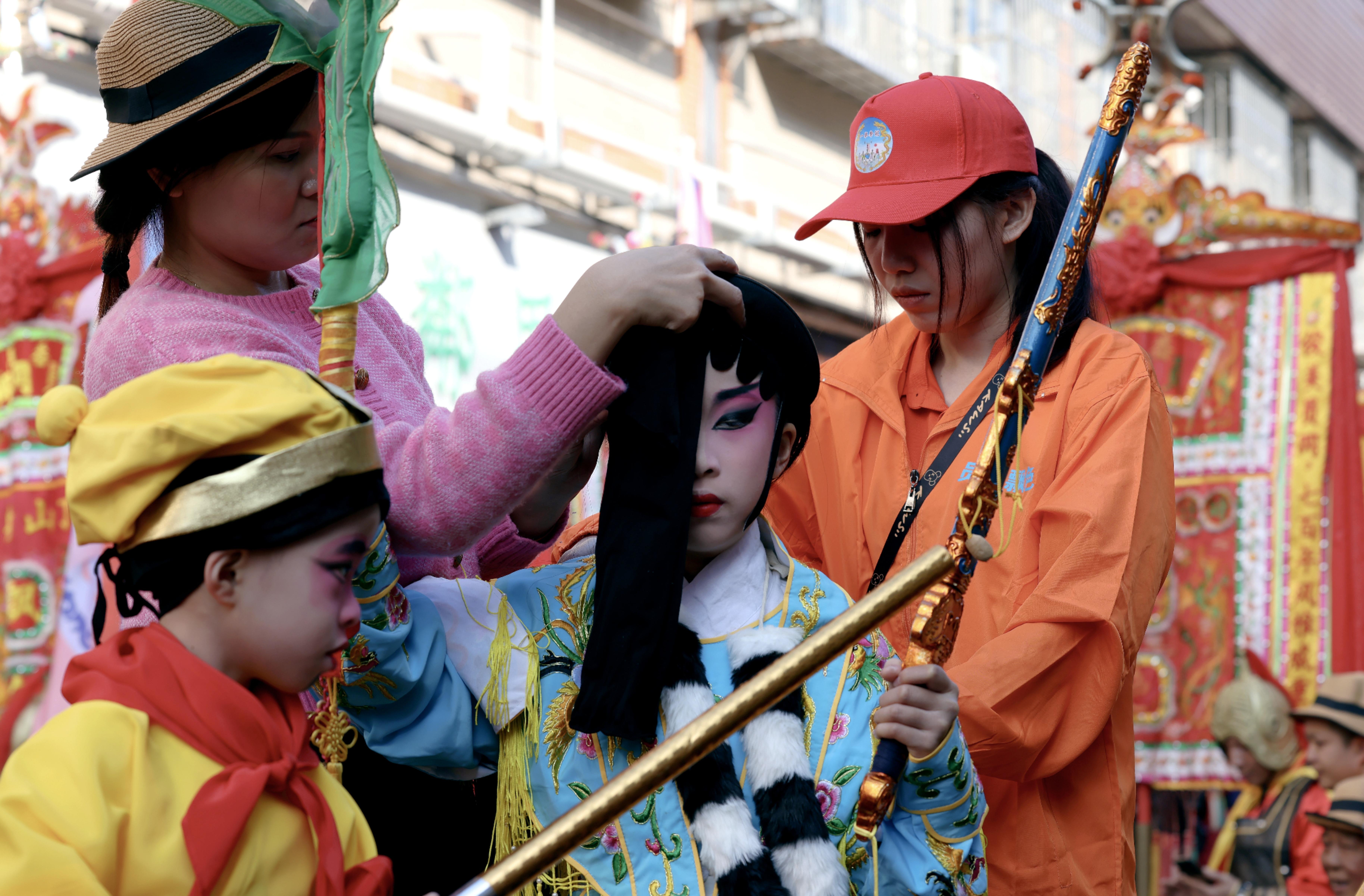 People help a child prepare to take part in a Piu Sik Parade in Yuangang village, Guangzhou, Guangdong province, Feb 16, 2024. (PARKER ZHENG / CHINA DAILY)