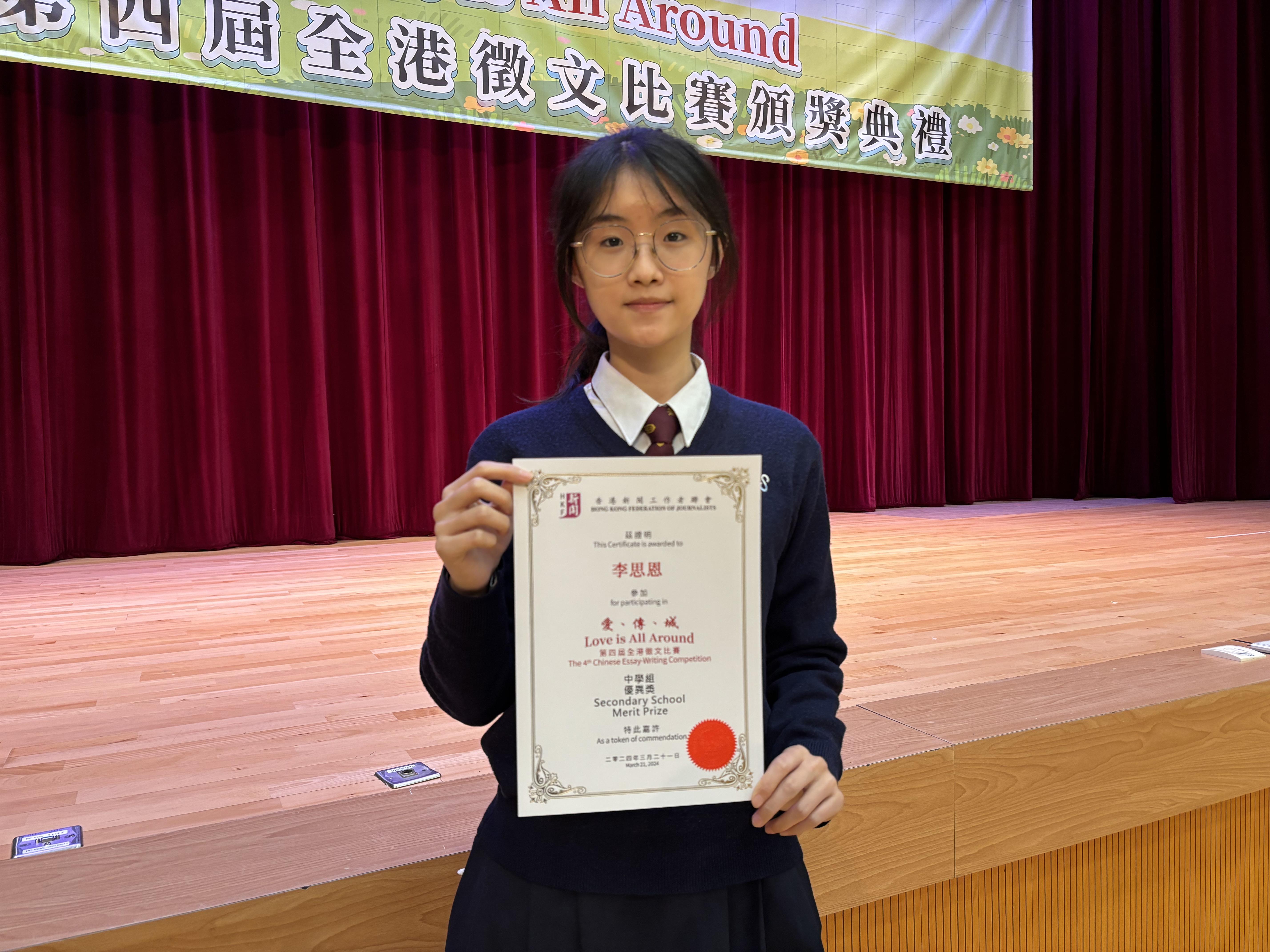 Lee Si-yun, a secondary school category awardee, poses for a photo after a prize-giving ceremony of the 4th "Love Is All Round" essay writing competition, in Wan Chai, Hong Kong, March 21, 2024. (GABY LIN / CHINA DAILY)