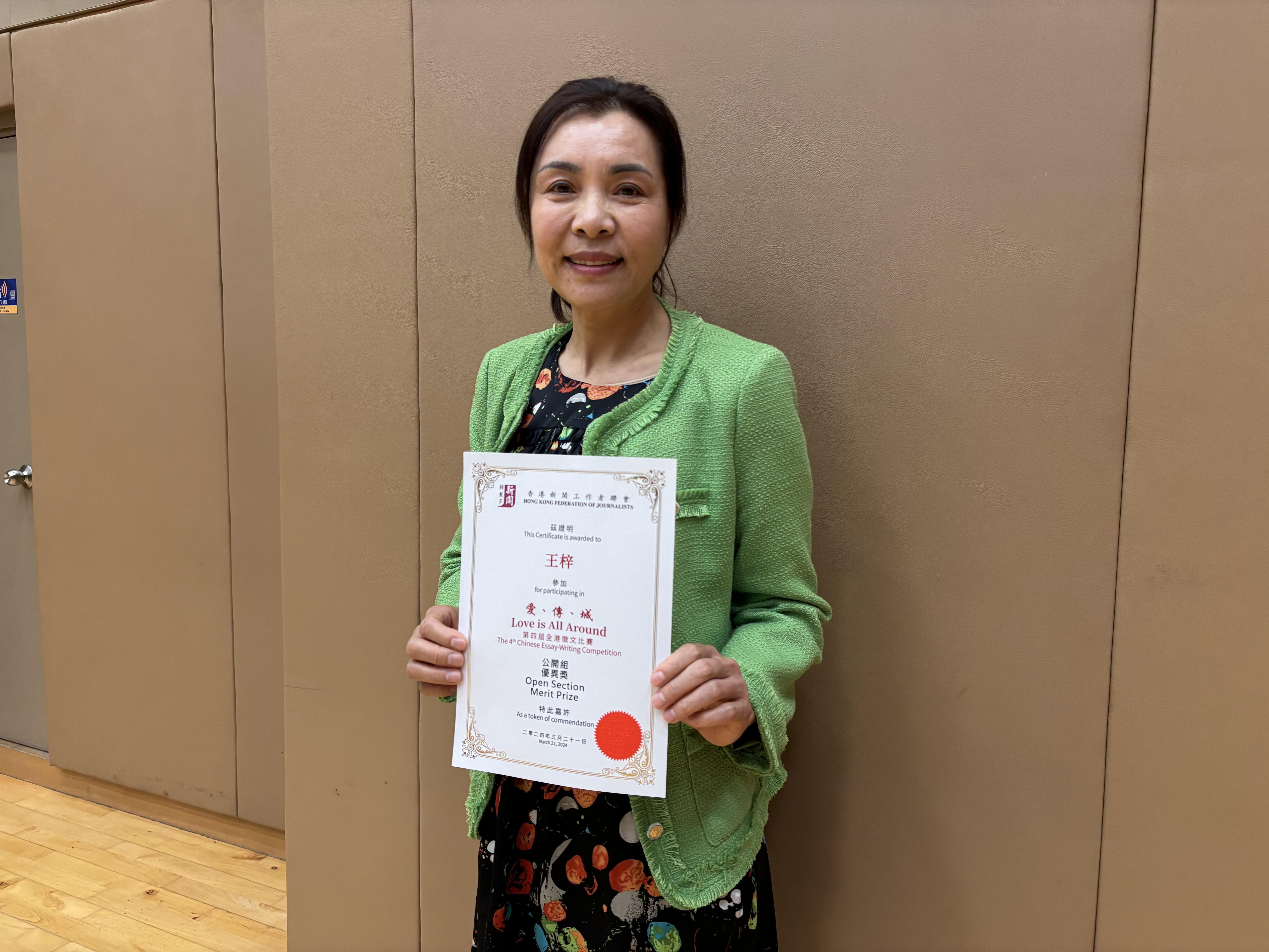Wang Zi, an open category awardee, poses for a photo after a prize-giving ceremony of the 4th "Love Is All Round" essay writing competition, in Wan Chai, Hong Kong, March 21, 2024. (GABY LIN / CHINA DAILY)