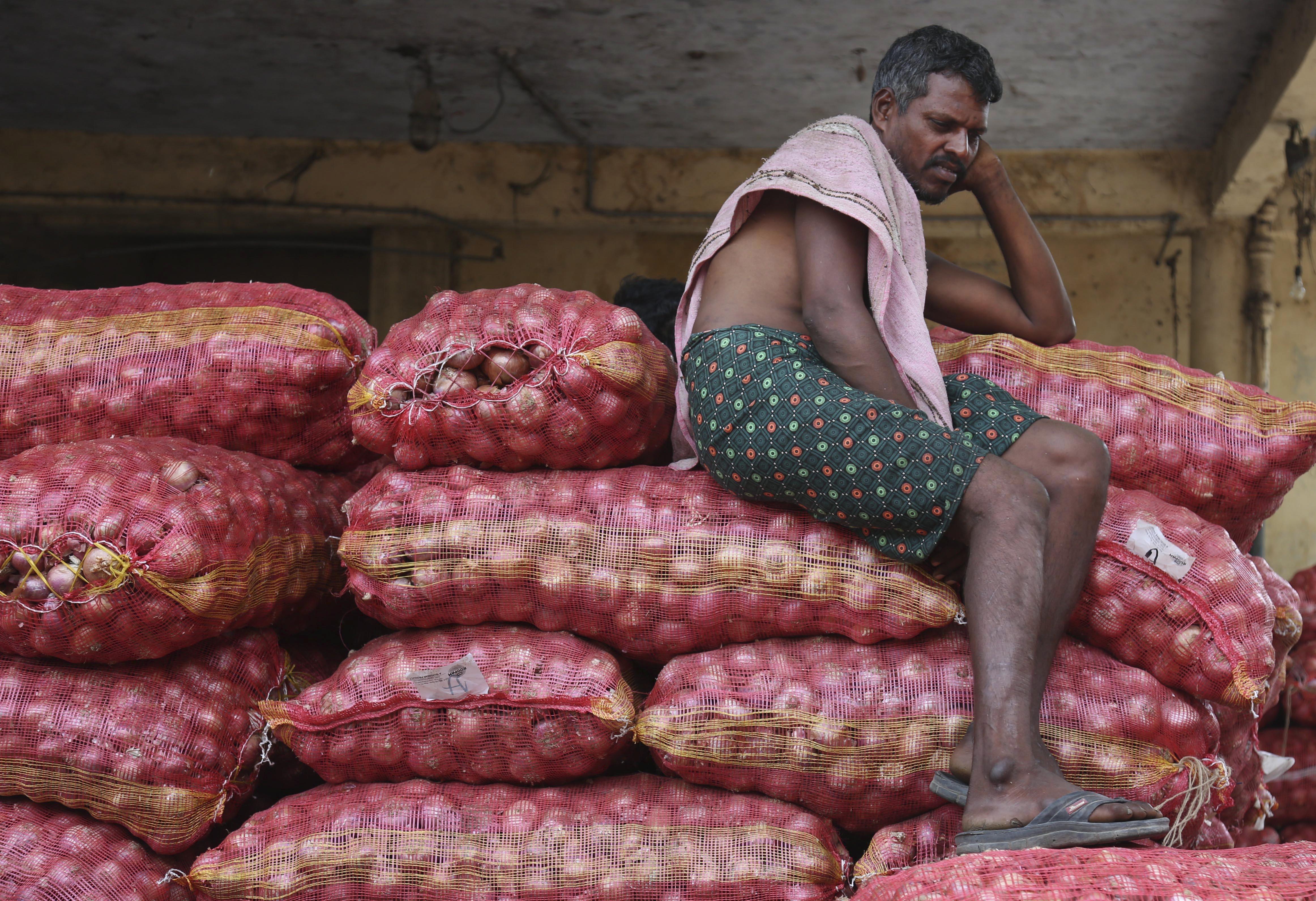 An Indian laborer rests on bags of onion at a wholesale market in Hyderabad, India, June 21, 2014. (PHOTO / AP)
