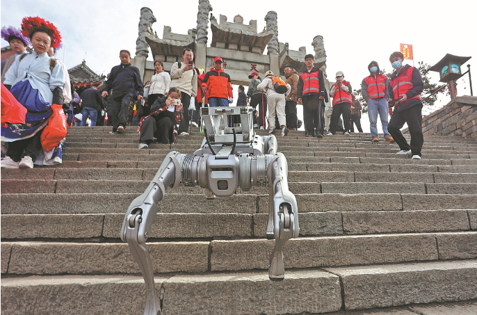 As hikers made their way up the steep slopes of Taishan on Monday, they were captivated by the sight of a robotic dog prototype carrying waste on its back, under the control of staff members.