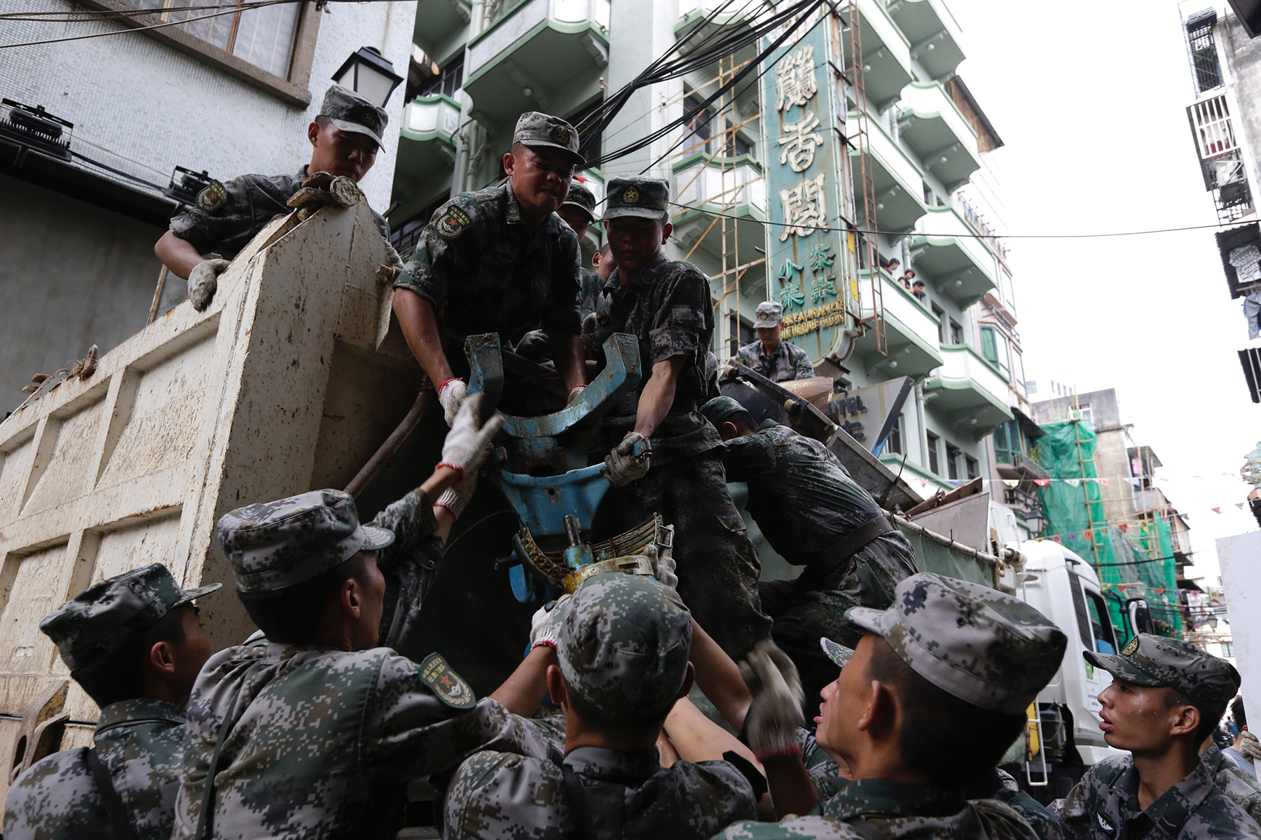 The People's Liberation Army Macao Garrison assists in rescue and recovery efforts on Aug 25, 2017, after the city was hit by Typhoon Hato, the most disastrous storm to hit the city in 53 years. (ROY LIU / CHINA DAILY)