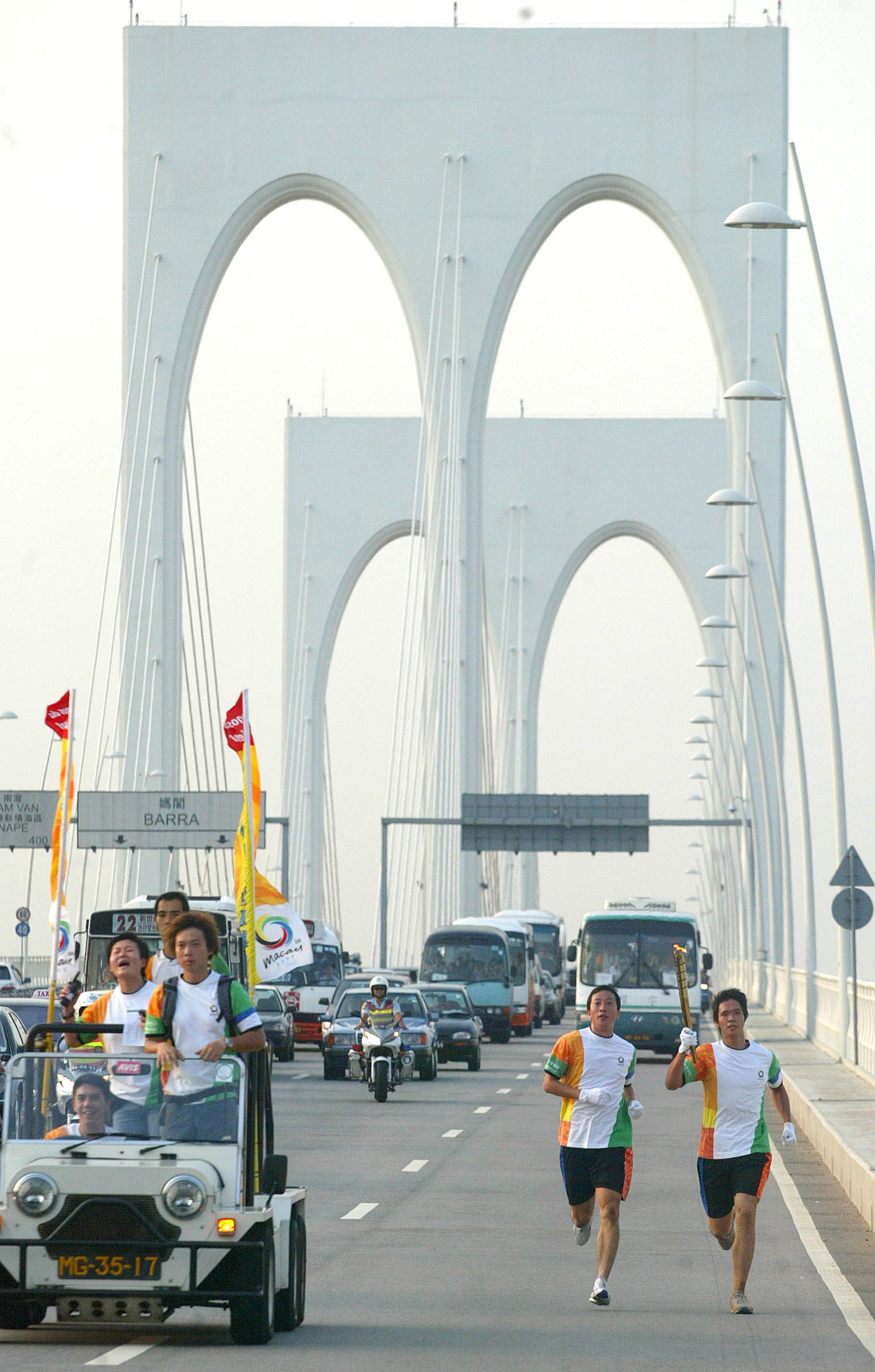 Torchbearers run across the Sai Van Bridge with flames of the East Asian Games on Sept 29, 2005. The bridge opened to traffic that year. (EDMOND TANG / CHINA DAILY)