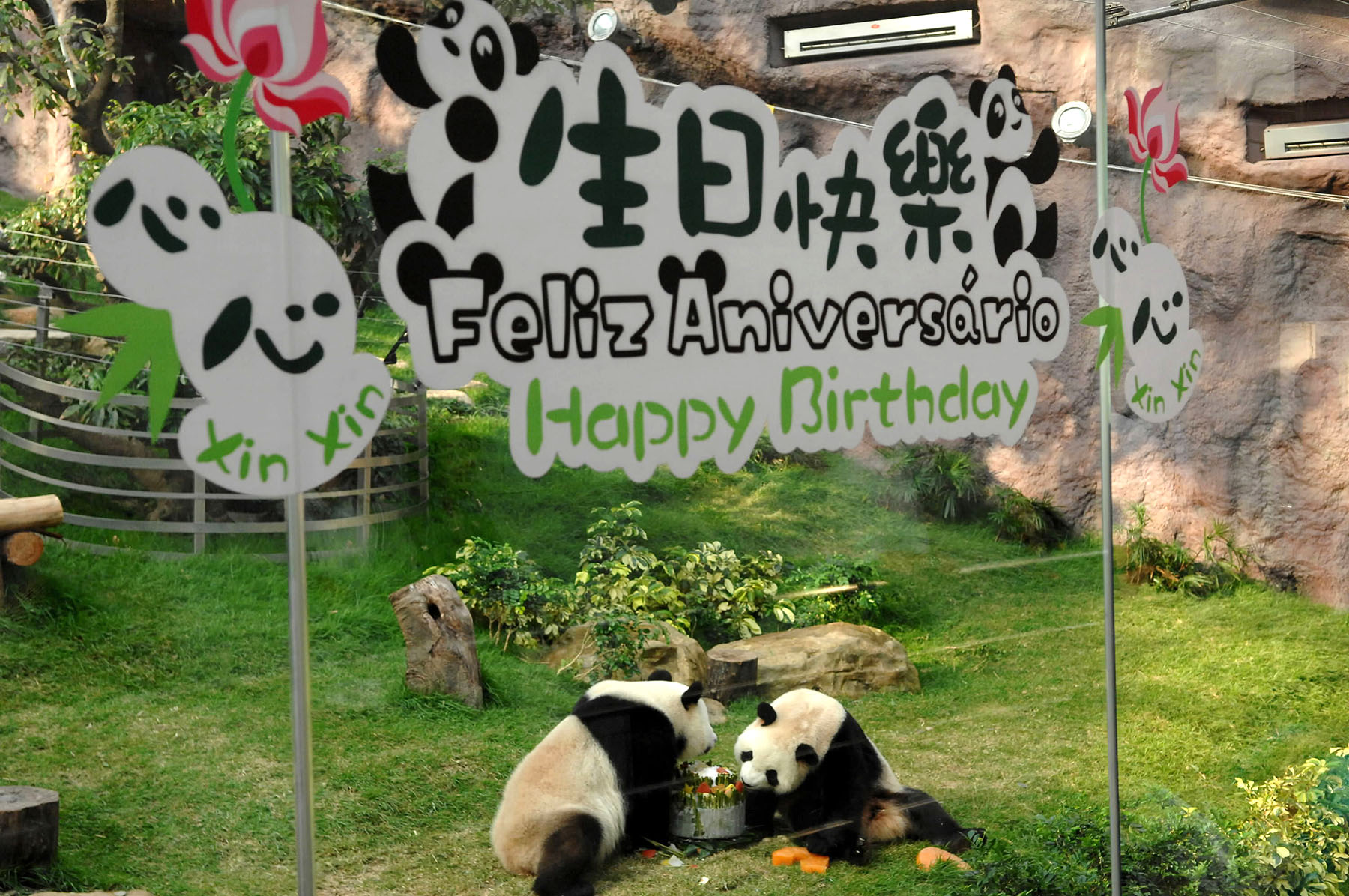 Pandas Kai Kai and Xin Xin enjoy a fruit cake as they celebrate their third birthday in 2011, their first in Macao. (PHOTO / XINHUA)