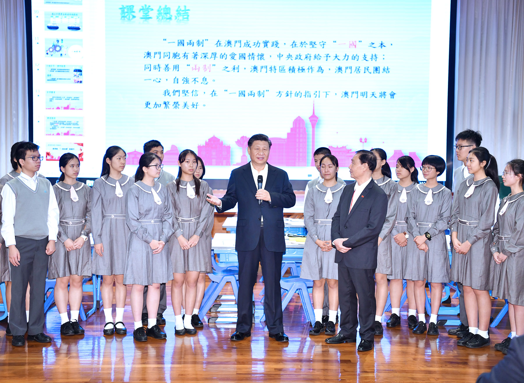 President Xi Jinping shares his thoughts after attending a history class on "one country, two systems" at the Premier School Affiliated to Hou Kong Middle School in Macao on Dec 19, 2019, as the SAR celebrates its 20th anniversary. (PHOTO / XINHUA)