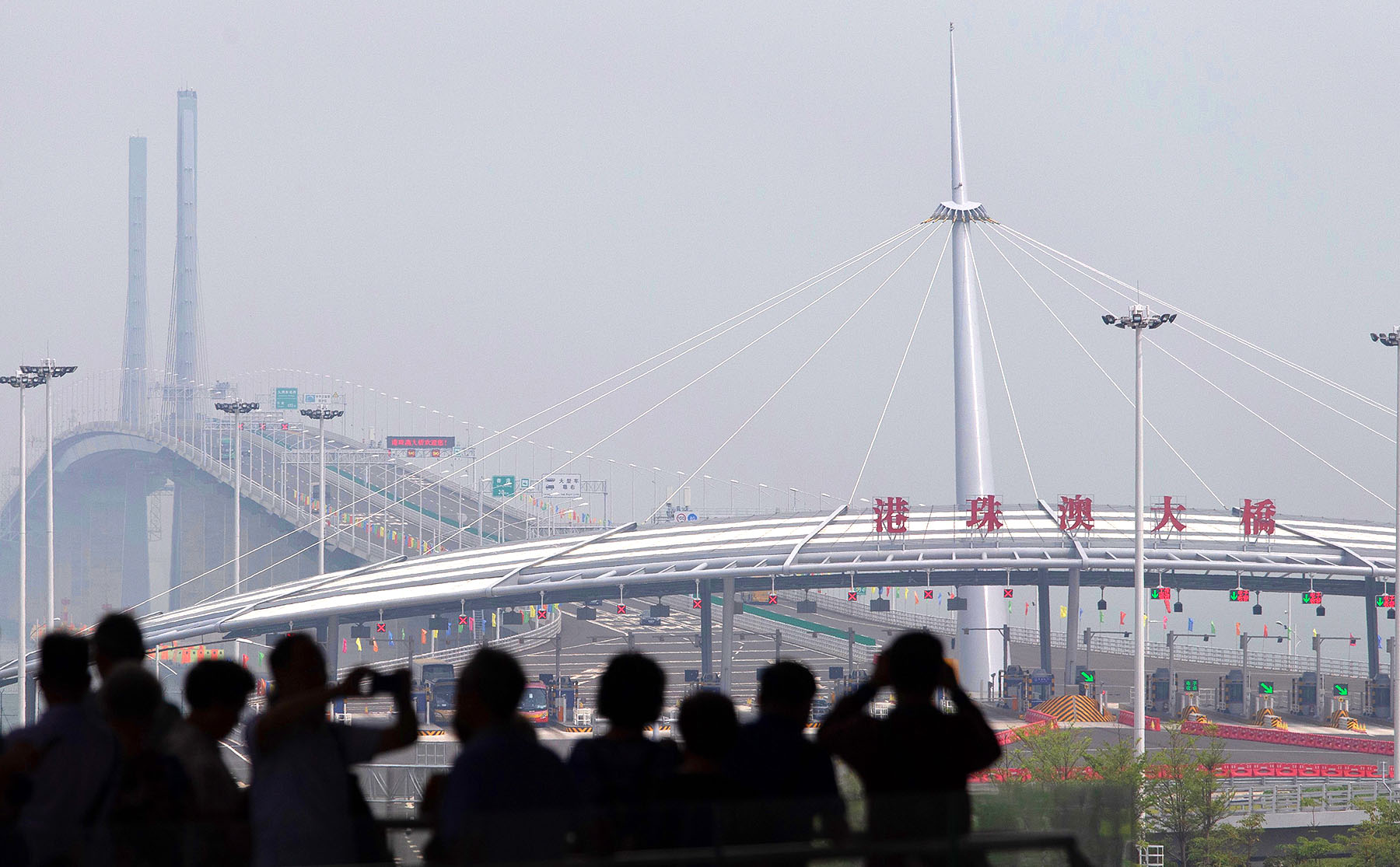 Passengers take pictures of the Hong Kong-Zhuhai-Macao Bridge at the Zhuhai Port on the first day of the bridge's operation on Oct 24, 2018. (ROY LIU / CHINA DAILY)