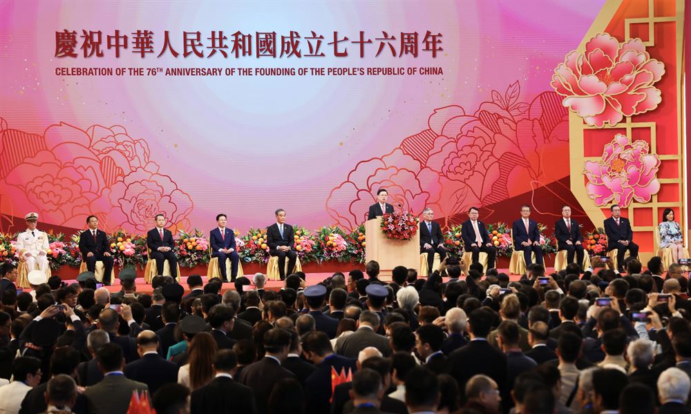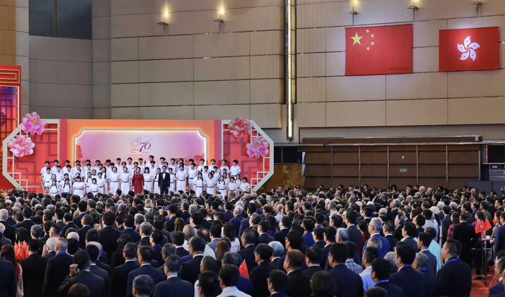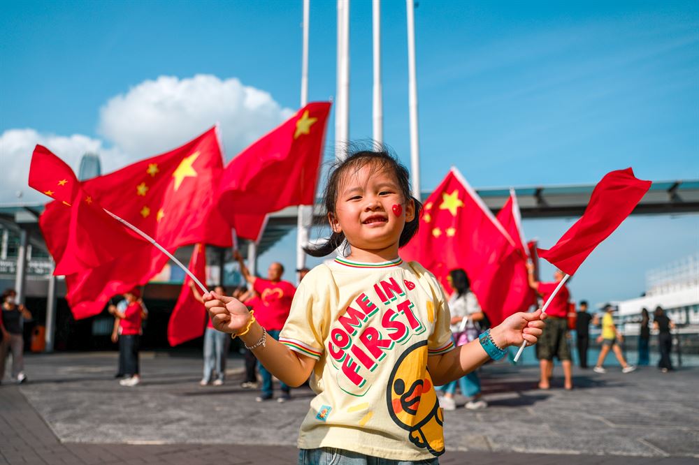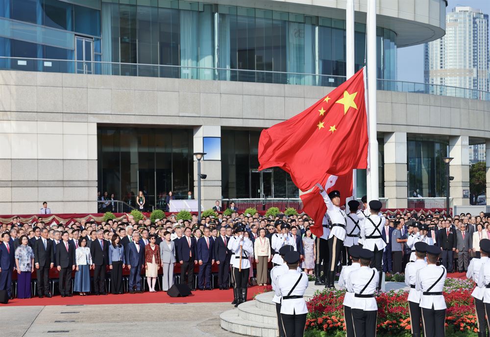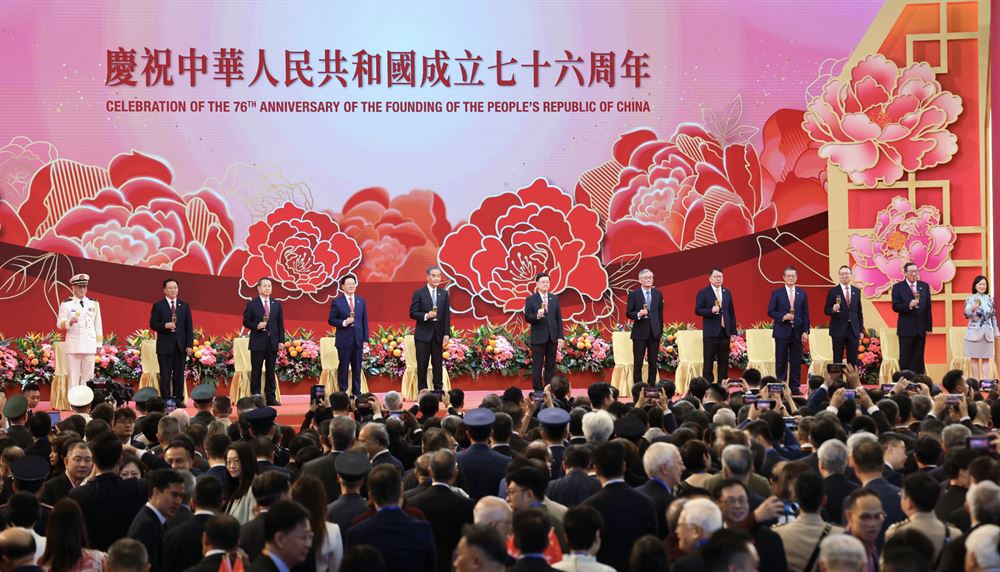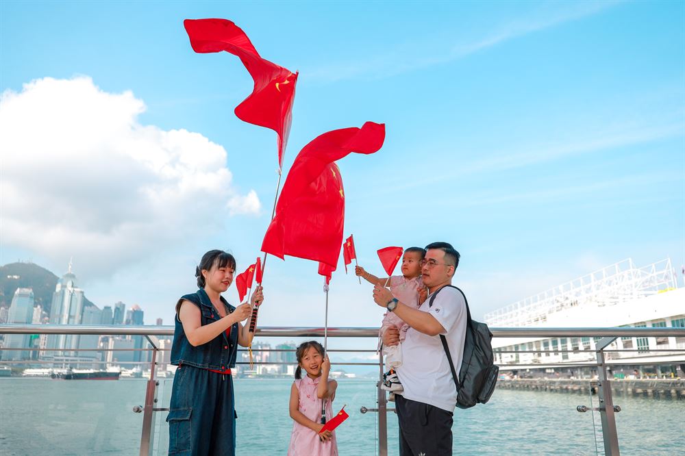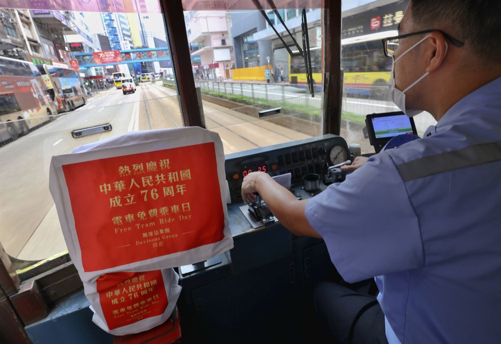 The Chinese national flag is raised in celebration of the 76th anniversary of the founding of the People's Republic of China at the Liaison Office of the Central People’s Government in the Hong Kong Special Administrative Region, in Hong Kong on Oct 1, 2025. (ANDY CHONG / CHINA DAILY)Zhou Ji (center), director of the Liaison Office of the Central People’s Government in the Hong Kong Special Administrative Region, waves to reporters after a flag-raising ceremony to mark of the 76th anniversary of the founding of the People's Republic of China at the Liaison Office of the Central People’s Government in the HKSAR, in Hong Kong on Oct 1, 2025. (ANDY CHONG / CHINA DAILY)Officials and guests make a toast during a National Day reception to celebrate the 76th anniversary of the founding of the People's Republic of China, in Hong Kong on Oct 1, 2025. (PARKER ZHENG / CHINA DAILY)HKSAR Chief Executive John Lee Ka-chiu delivers a speech during a National Day reception to celebrate the 76th anniversary of the founding of the People's Republic of China, in Hong Kong on Oct 1, 2025. (PARKER ZHENG / CHINA DAILY)Young students and artists perform during a National Day reception to celebrate the 76th anniversary of the founding of the People's Republic of China, in Hong Kong on Oct 1, 2025. (PARKER ZHENG / CHINA DAILY)A fire boat sprays water in front of the Hong Kong Convention and Exhibition Centre to celebrate the 76th anniversary of the founding of the People's Republic of China, in Hong Kong on Oct 1, 2025. (ANDY CHONG / CHINA DAILY)A girl smiles while posing with the Chinese national flags to celebrate the 76th anniversary of the founding of the People's Republic of China, in Hong Kong on Oct 1, 2025. (ANDY CHONG / CHINA DAILY)People walk through entry gates for a free ferry ride to celebrate the 76th anniversary of the founding of the People's Republic of China, in Hong Kong on Oct 1, 2025. (ANDY CHONG / CHINA DAILY)A sign reading "Celebrating the 76th Anniversary of the Founding of the People's Republic of China - Free Tram Ride Day" is seen in a tram in Hong Kong, as the city offers free tram rides on Oct 1 to celebrate the 76th anniversary of the founding of the People's Republic of China. (PARKER ZHENG / CHINA DAILY)