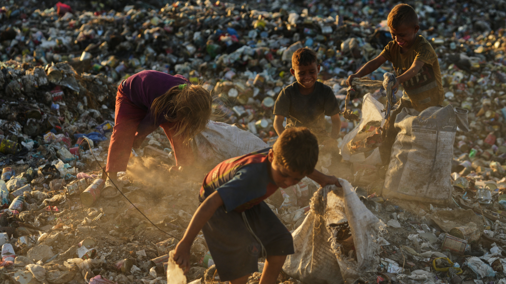 Displaced Palestinian children search for firewood and plastic in a landfill beside the makeshift tent camp where they are taking shelter, in Khan Younis, southern Gaza Strip, Sept 30, 2025. (PHOTO / AP)