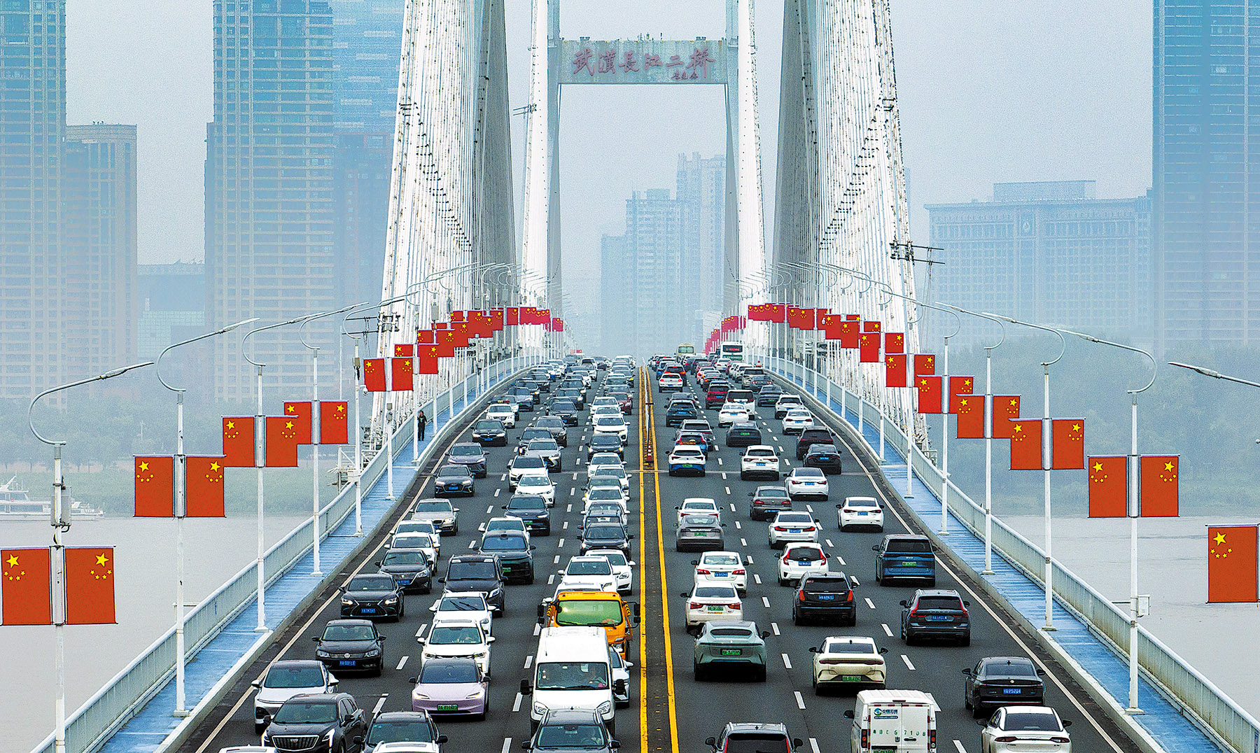 Vehicles cross the Second Yangtze River Bridge in Wuhan, Hubei province, on Oct 1, 2025, the first day of the National Day holiday, with various places experiencing peak travel traffic. (PHOTO / XINHUA)