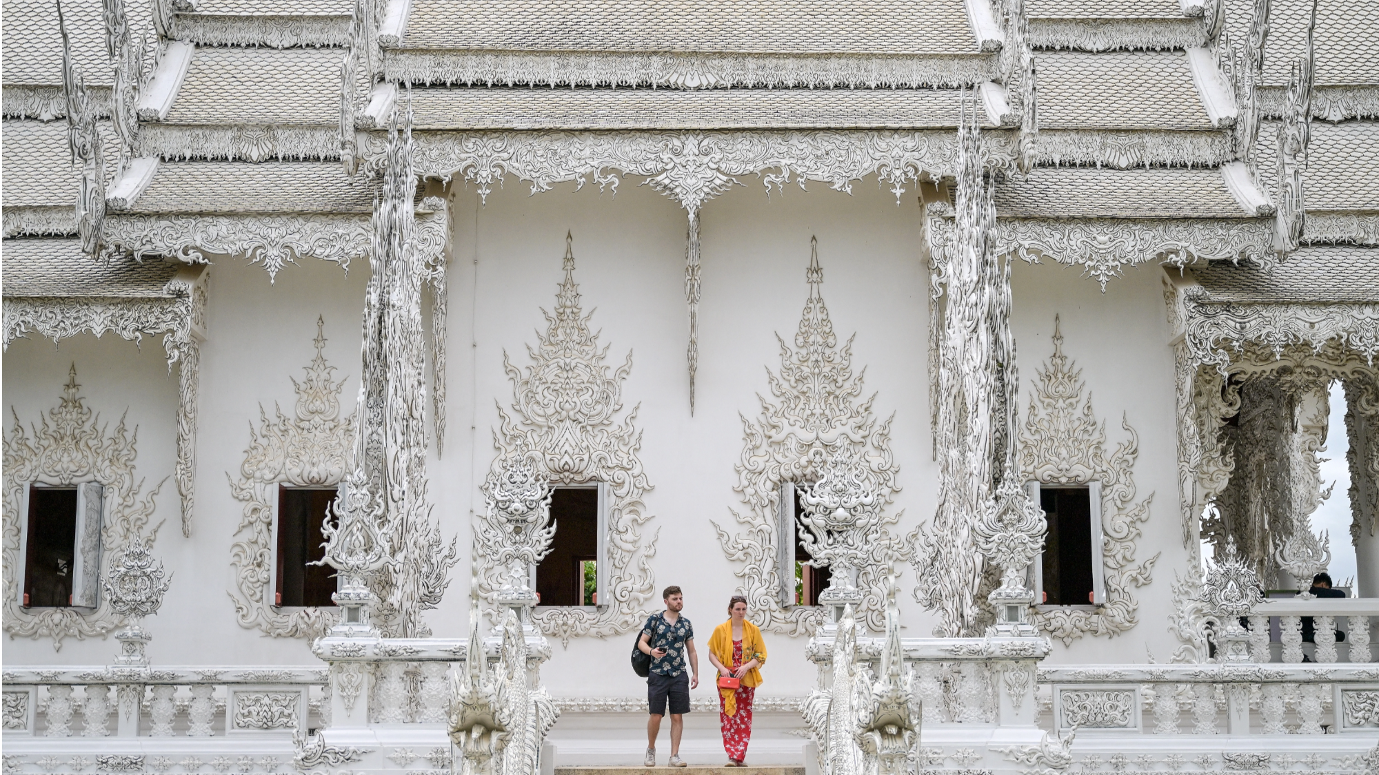 This picture taken on May 24, 2025, shows tourists visiting the Wat Rong Khun Buddhist temple, popularly known as "White Temple", in northern Thailand's Chiang Rai province. (PHOTO / AFP)