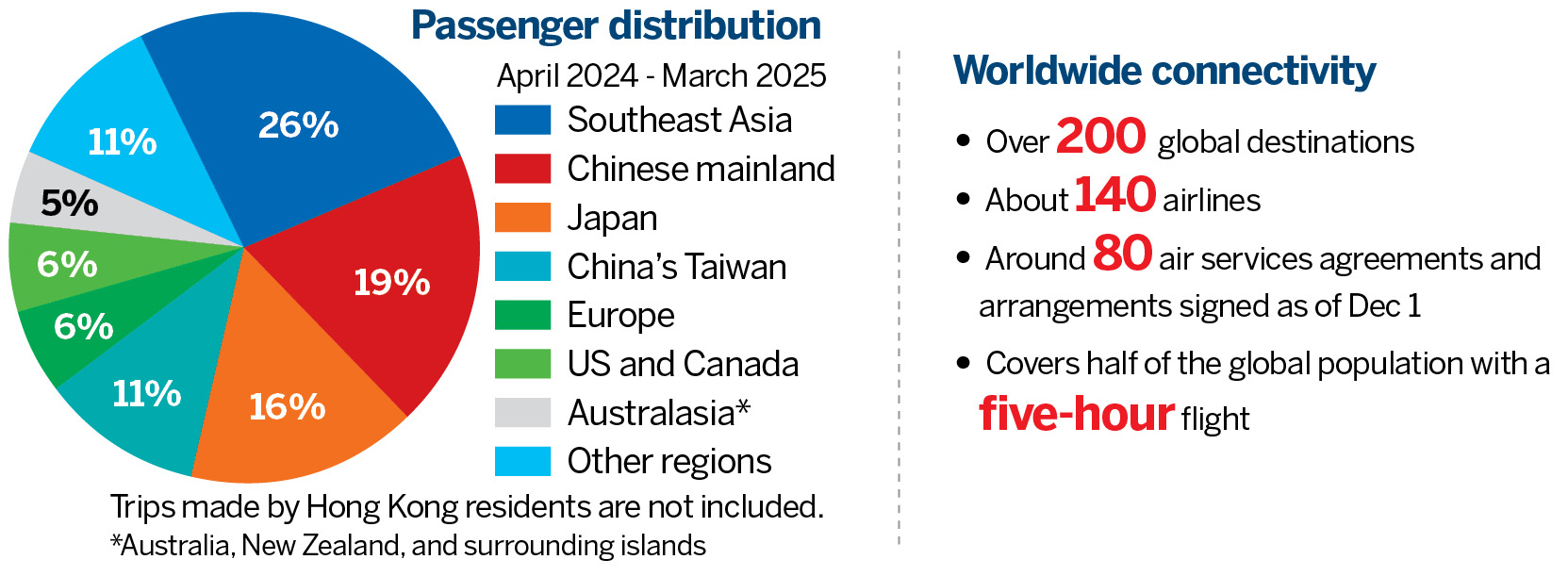 Editor’s note: This is the fourth installment in China Daily’s eight-part data series on Hong Kong’s growth as “eight centers” under the nation’s 14th Five‑Year Plan (2021–25). This part takes a look at the city’s role as an international aviation hub.