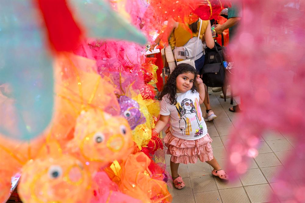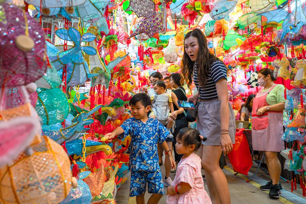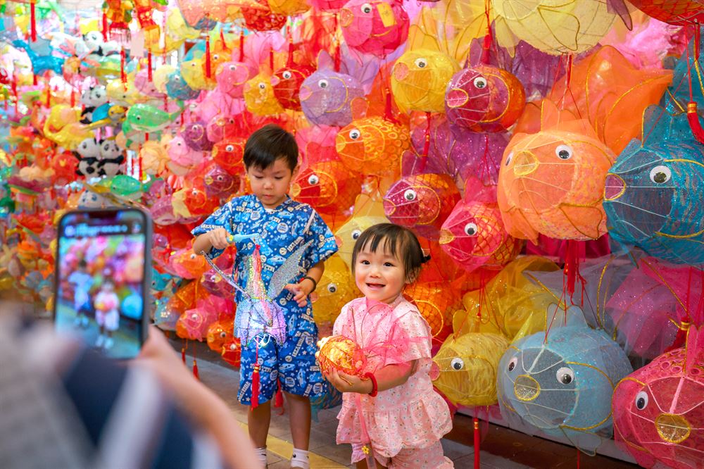 Children pose with lanterns at the Tai Kiu Market, in Yuen Long, Hong Kong, Oct 3, 2025. (ANDY CHONG / CHINA DAILY)